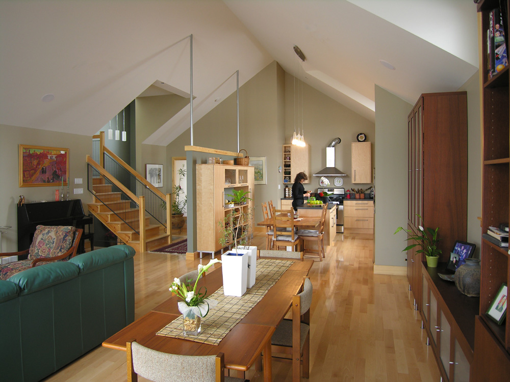 The reconstruction activities involved adding a storey over the garage, to accommodate a new master bedroom, en-suite bathroom and large day-lit closets. She points out that most suburban closets rely on artificial lighting, which often will not reveal the true nature of ones clothing selection - you find out when you are outside and already late. Larisa explains that the house in its earlier life had three poky bedrooms. Now it has two large bedrooms and an office area which can be turned into a third bedroom - but this time the house has a sense of spaciousness, rather than being a collection of small spaces. Larisa followed the design approach expounded in the arts and crafts period - that you get better results when you enlarge a cottage than try to reproduce Versailles on a suburban lot, but the model was different: “Once I decided it was a condominium it was easy.” Larisa also wonders why we still build houses with the main rooms facing the street. The main rooms now face west to its modest-sized garden - rendered private by those mature evergreens. Of course, you can find the expected features of an architects own house: lots of wood, a general concern about energy-efficiency, and lighting - both natural and artificial. And yes, although “completed” last year, there are those bits and pieces not quite finished - although typically such things are tidied up just before the architect-owner decides to sell the house.
